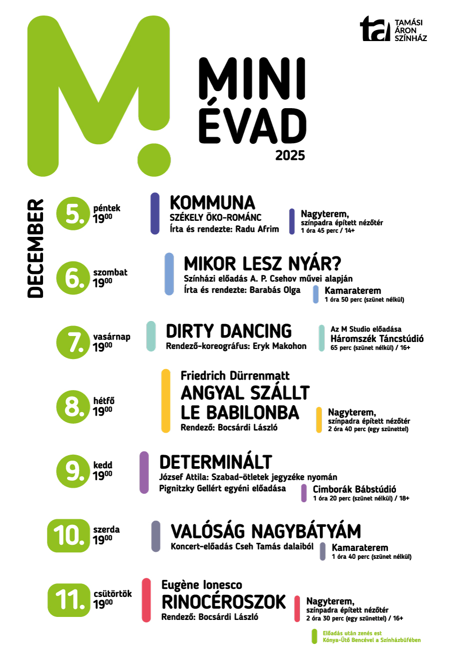 Lassan hagyománya lesz ennek a rendezvénynek, melyet a korábbi években ősszel tartott a színház, ezúttal azonban a december 5–11. közötti adventi időszakban kerül rá sor. Az idei miniévadot Radu Afrim vadonatúj előadása, a napokban bemutatott Kommuna – székely öko-románc nyitja, majd Barabás Olga Mikor lesz nyár? című Csehov átirata következik (december 6). Ezután az M Studio Mozgásszínház Eryk Makohon által rendezett Dirty Dancing című táncelőadása (december 7), majd a Bocsárdi László által rendezett Angyal szállt le Babilonba (december 8) kerül műsorra. Pignitzky Gellér Determinált című egyéni produkciója (december 9), majd a Gajzágó Zsuzsa által összeállított Valóság nagybátyám című koncert-előadás (december 10) lesznek a továbbiak, végül pedig az ugyancsak Bocsárdi által rendezett Rinocéroszok című koprodukció zárja (december 11) az idei miniévad műsorát. Minden előadás este 7 órától kezdődik.