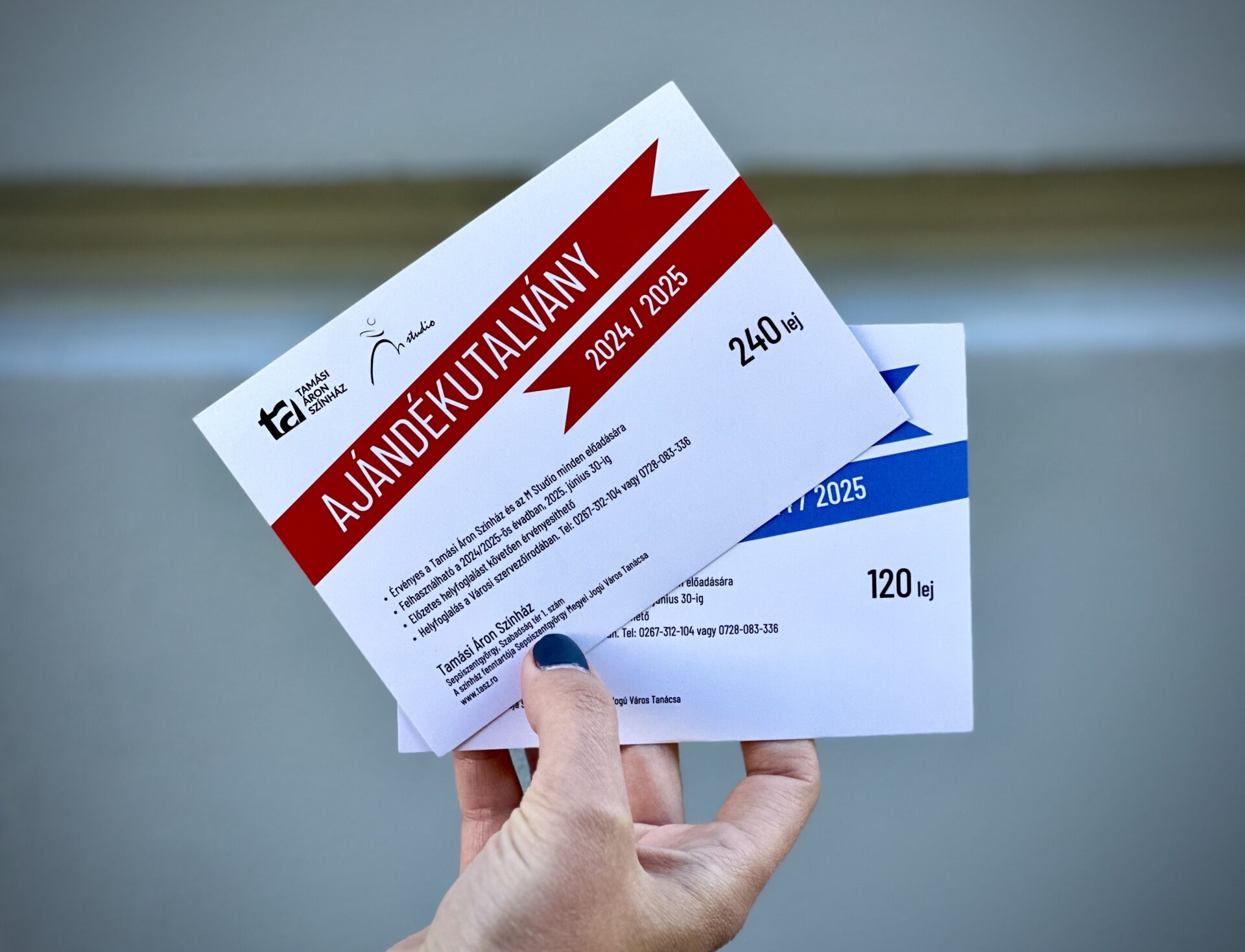 Teatrul Tamási Áron oferă şi în stagiunea 2024/2025 vouchere cadou, pe care spectatorii le pot achiziţiona începând din 10 octombrie, de la Biroul Municipal de Organizare din Sfântu Gheorghe. Se pun în vânzare două tipuri de vouchere cadou, în valoare de 120 și 240 lei.